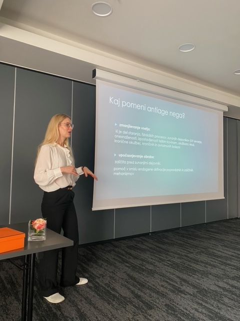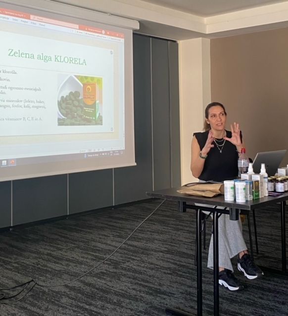 Ajda Rodman med predavanjem, kako ohranjati ravnovesje v delovanju ženskih hormonov po 40.letu