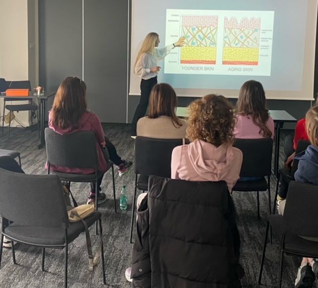 Predavanje o osnovah nege kože s podrobno predstavljenimi kozmetičnimi izdelki in priporočenih sestavinah